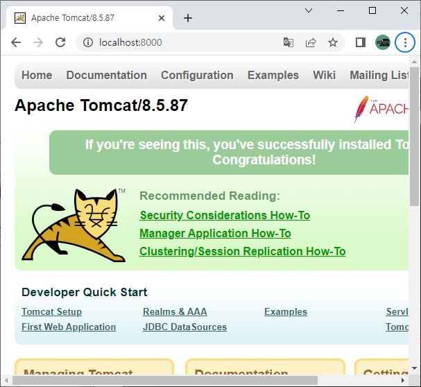 3. localhost:8000 으로 접속해주면 톰캣이 실행된걸 확인할 수 있습니다. ( 서버를 끄고싶으면 새로켜진 터미널을 끄면됨.)