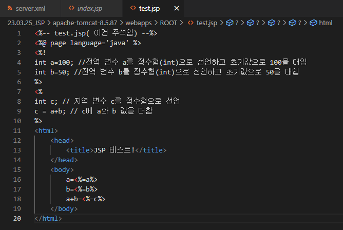 16행에서 18행까지 사용된 <%=은 연산의 결과를 문자열로 변환하여 출력하는 태그입니다.