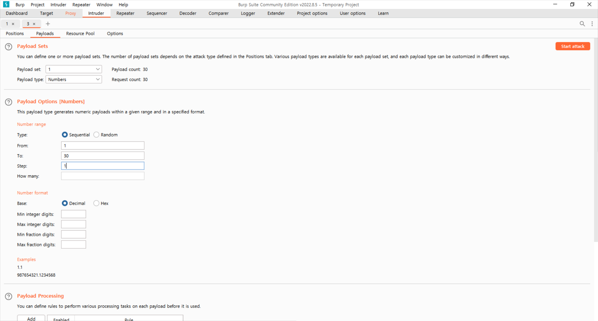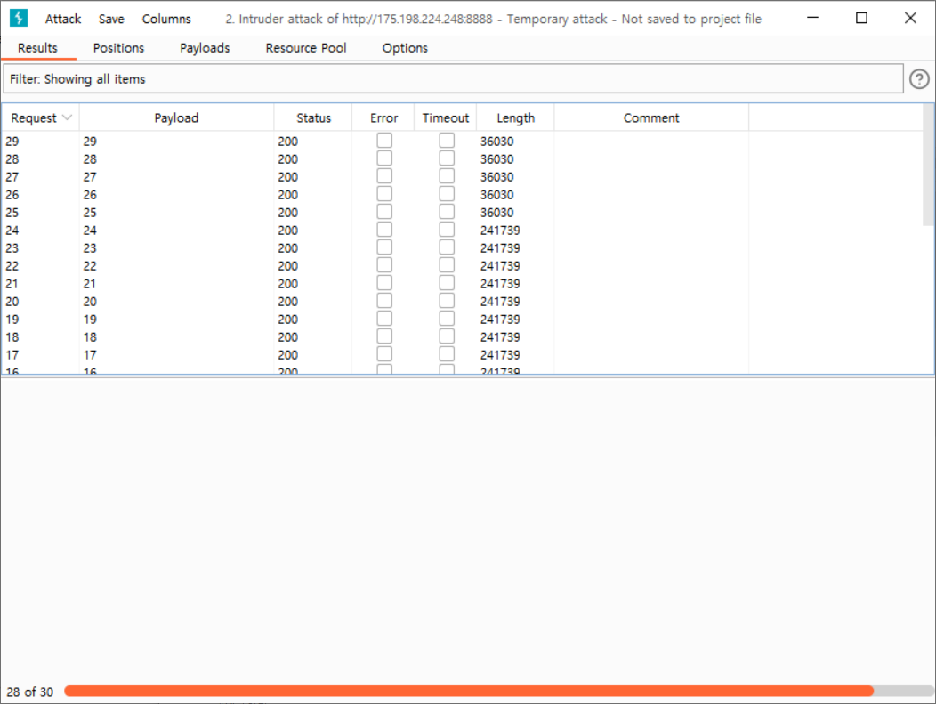 = 스타트 어택 ( 25부터 응답값 Length 가 확 낮아진 모습 )
