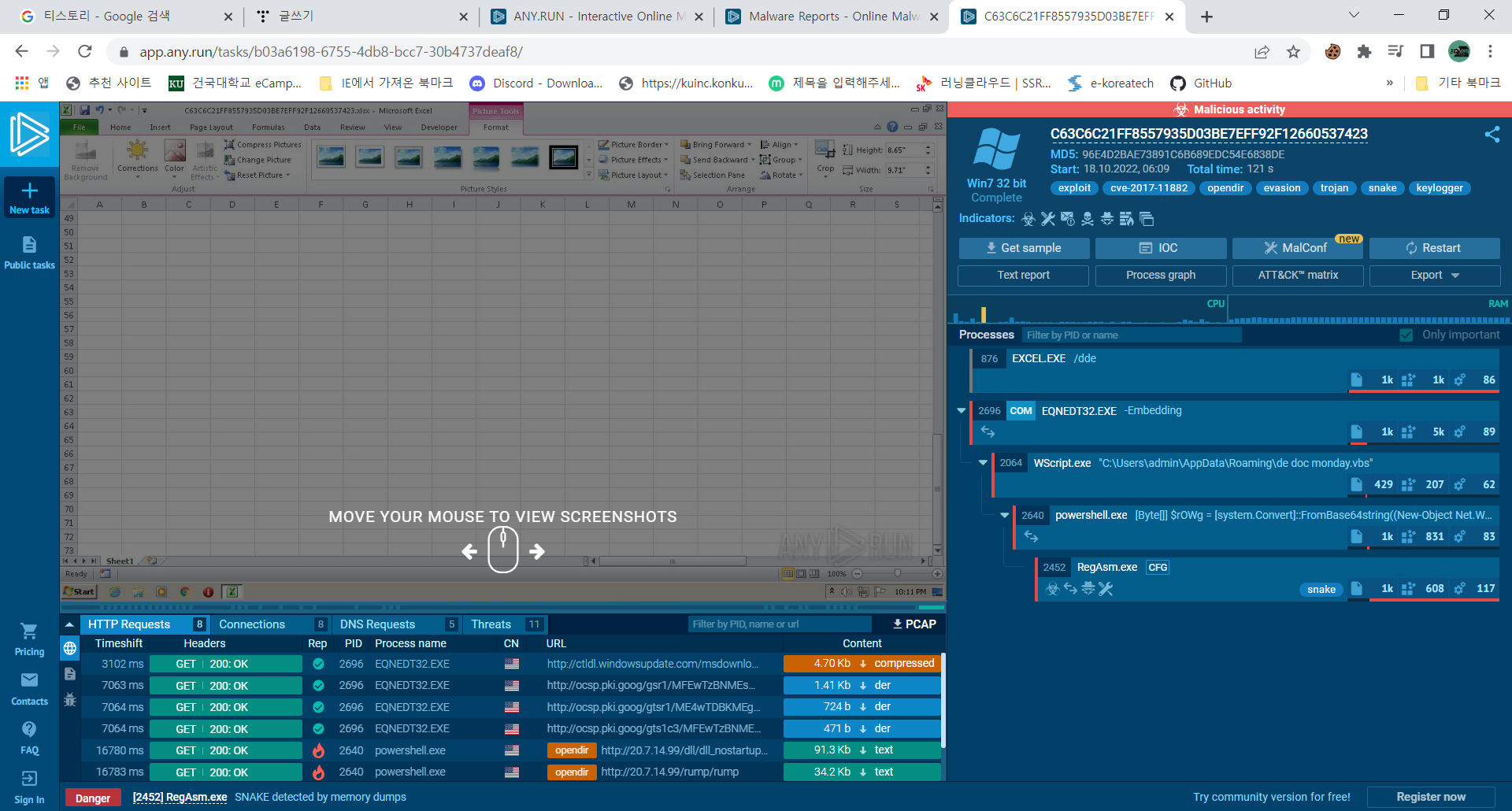 악성코드로 인해 EXCEL.EXE를 실행했을때 아래로 쭉 다른 프로그램이 실행되는 피해사례를 보여줌