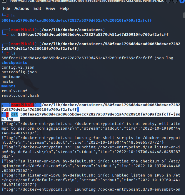 ┌──(root㉿kali)-[/var/lib/docker/containers/580feae1796d8d4cad0665bde4cc72827a5379d451a47d20910fe769af2afcff]
