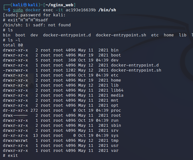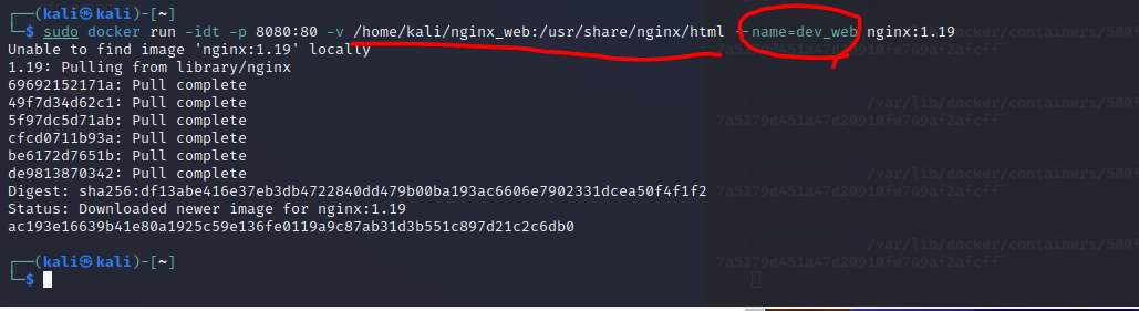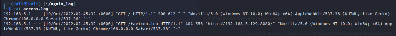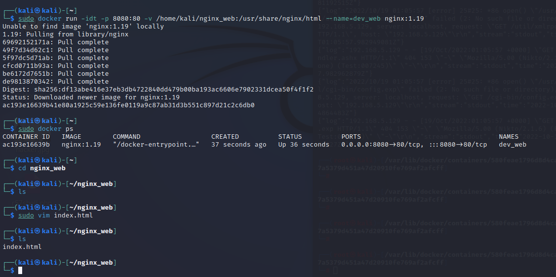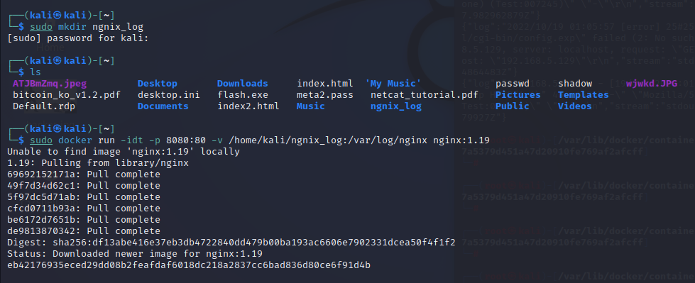 $ sudo docker run -idt -p 8080:80 -v /home/kali/ngnix_log:/var/log/nginx nginx:1.19
