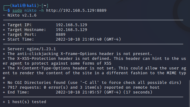 $ sudo nikto -h http://192.168.5.129:8889